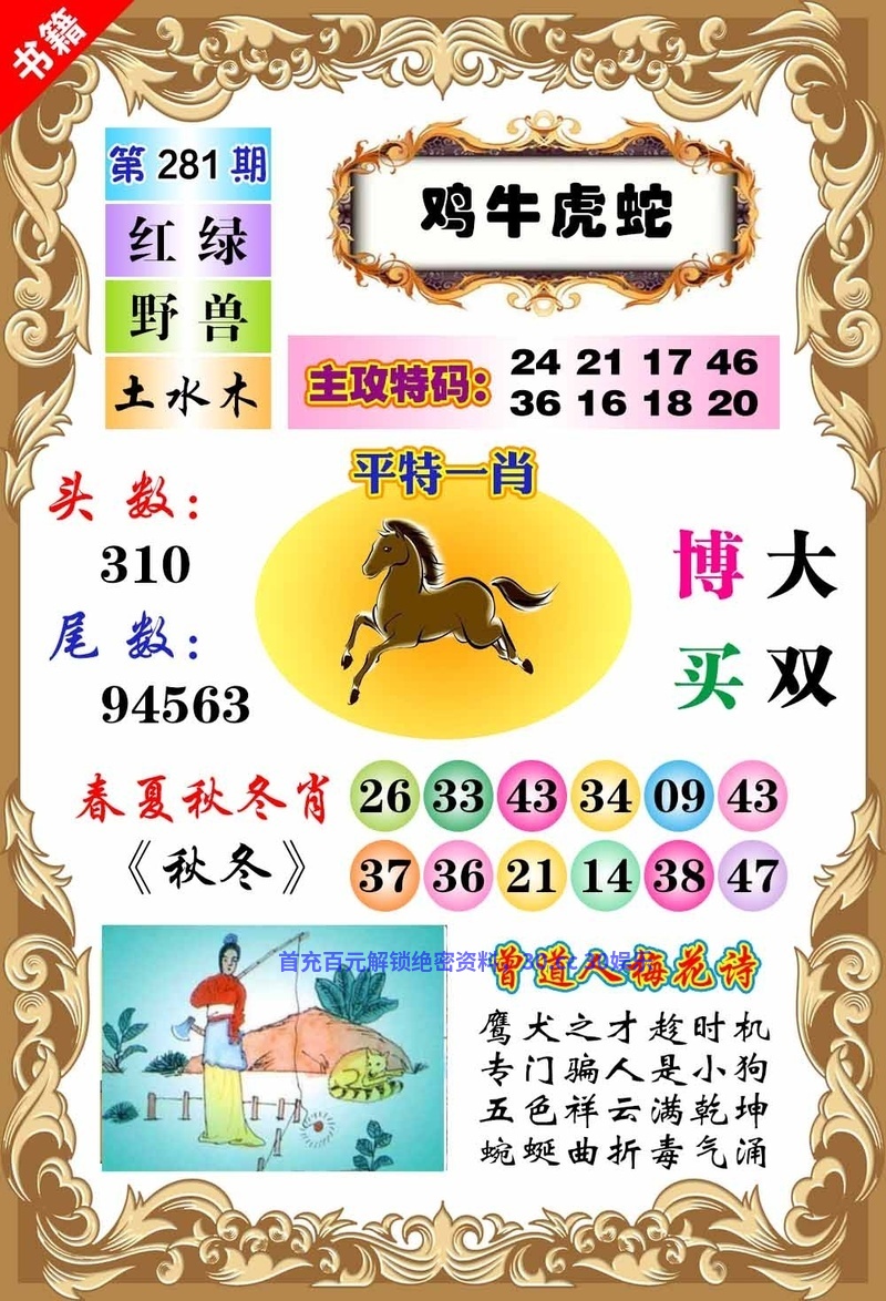 282期曾道人梅花诗:牛跑狍追木桶喜,两手腾空谁来合,龙凤呈祥事事发,二一三三玄机数 解释:牛跑狍追木桶喜,两手腾空谁来合,龙凤呈祥事事发,二一三三玄机数解鸡猴肖 综合解肖:鸡猴猪龙虎牛兔狗马 | |||||||||||||||||||||||||||||||||