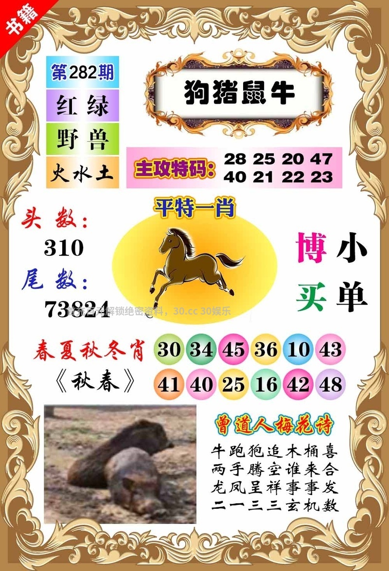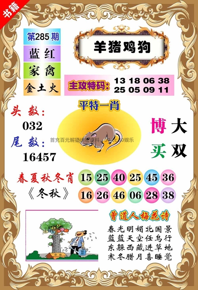 286期曾道人梅花诗:三十风流八有凭,惊雷怕雨狗相伴,七零八落皆有命,餐餐无忧肉肥腻 解释:三十风流八有凭,惊雷怕雨狗相伴,七零八落皆有命,餐餐无忧肉肥腻解狗兔肖 综合解肖:狗兔羊虎龙鸡蛇牛马 主特12码:08.20.03.15.23.35.04.16.02.38.09.45 | |||||||||||||||||||||||||||||||||